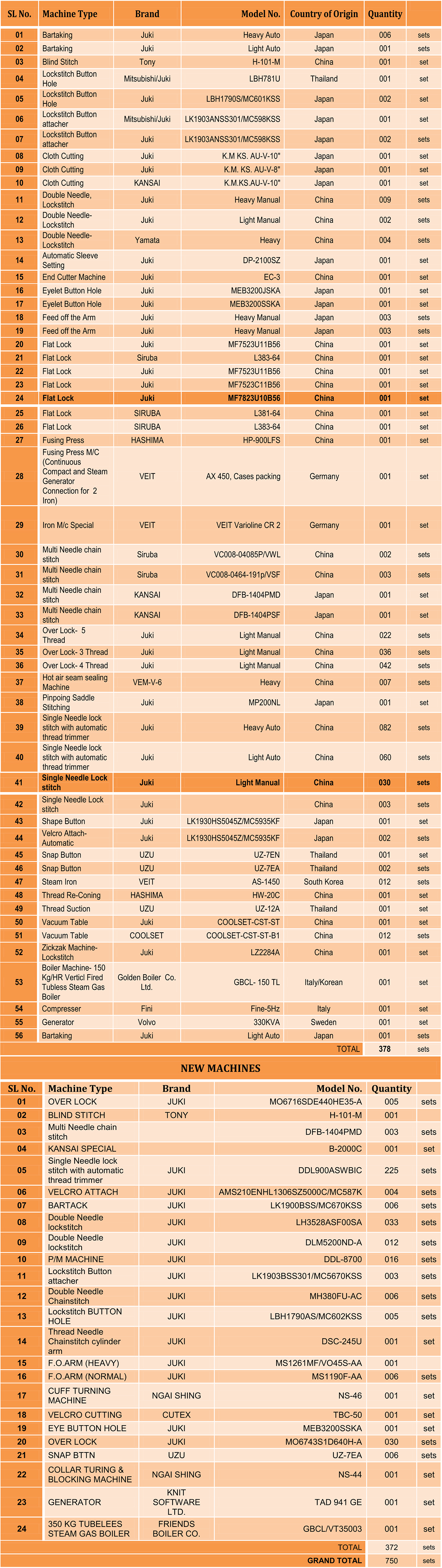 The SFPL has well equipped factories with the latest machinery to produce quality garments. Our commitment to constantly upgrading our infrastructure and resources is evident from our impressive array of state of the art machinery.