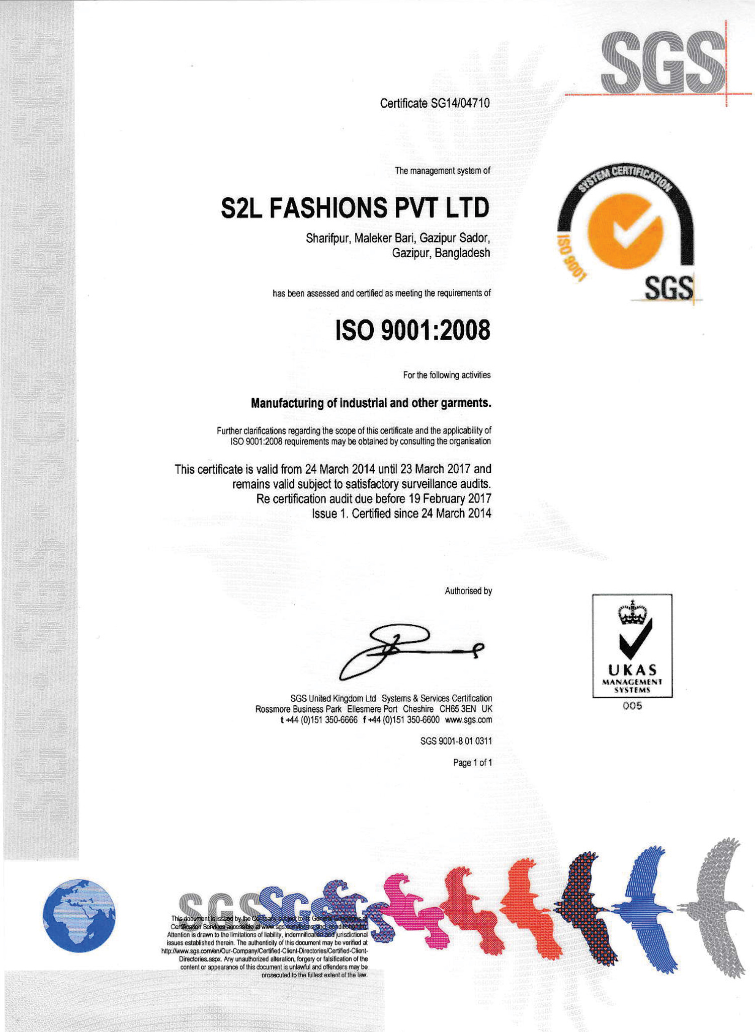 S2L FASHIONS assigns duties and responsibilities to its employees for regular monitoring, supervision and strict compliance of the COC. They inspect frequently and keep record if any non-compliant activities are found at floors and sections. Inspection is done without hampering any process or speed of production or any disruption in the performance of works. They may interview the concerned persons where it is deemed necessary for any specific occurrence. Officer in charge of the Code of Conduct (Compliance) reports to the top management from time to time of any non-compliance of this policy and ensures appropriate remedial measures in this regard. - CERTIFIED - (ISO 9001:2008 certified company) - (PPE Article 11 (B) certified from SGS)